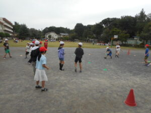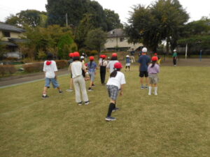 校庭は6年2組がリーダーの班です。だるまさんが転んだやドッジボールなど、秋を感じながら外遊びを楽しみました。