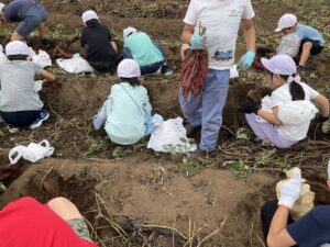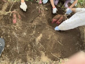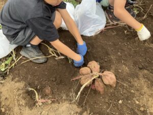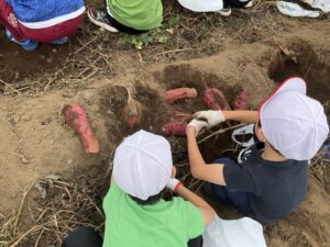 今年は、太陽の光が強く、大きなさつまいもができたとのこと。大きなかぶを引き抜くように、さつまいもを引き抜く子供たちの姿が印象的でした。