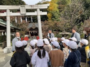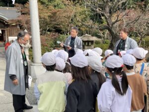 鳥居をくぐり、手水社で身を清めた後は、二礼二拍手一礼の挨拶の作法を学びました。
