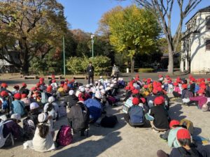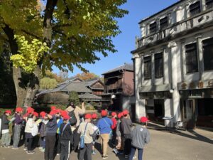 落ち葉が舞い散る中、3年生が小金井公園江戸東京たてもの園に行ってきました。