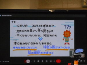 薬を決められた量より多く飲んだり、早く治りたいから何回も飲むと、気持ち悪くなったり、呼吸や脈が早くなったり、脳の細胞が傷つくことが説明されました。傷ついた脳は治らないので、薬を飲むときはお家の人と相談して決められた量を決められた時間に飲むことを学びました。