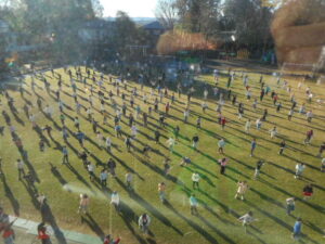 朝の時間は、600人を超える子供たちが一斉に音楽に合わせてリズム縄跳びをします。担任の中には二重とびを軽々と跳んでいる教員もいて、みんなで目標をもって取り組んでいます。