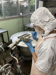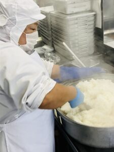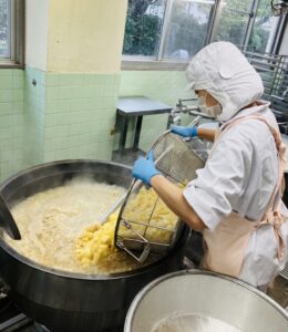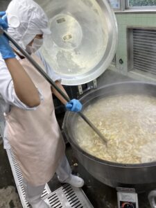 今日は、給食でよく登場するお魚“さば”を生姜、しょうゆ、みりんで味付けしてオーブンでこんがり焼いた 『鯖のしょうが焼き』と、『青菜とじゃこ炒め』です。
