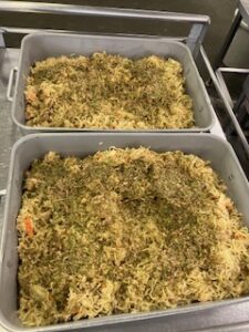 細かく刻んだ中華麺を野菜やお肉と一緒に炒めて、ソース味のごはんと合わせた料理。