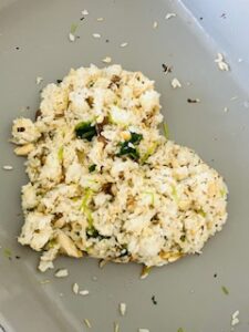 焼いたさばを一度手でほぐして、青じそ、ごま、甘酢生姜、たくあんと一緒にごはんに混ぜていきます♪