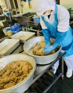 鶏ひき肉とみそ、しょうゆ等の調味料と合わせて練っていきます。