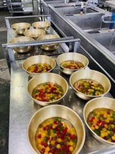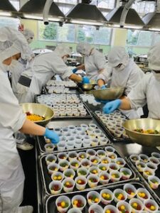給食室のみんなでカップに入れていきます。
