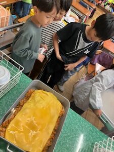 ただし1人1個は難しいので、クラスで1つの巨大オムライスを作りました。