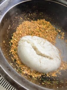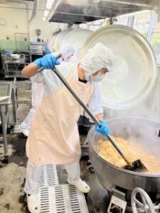 低学年は、キムチの汁をしぼって、辛みをおさえて作っています。