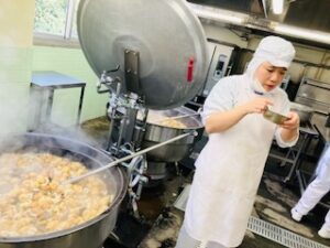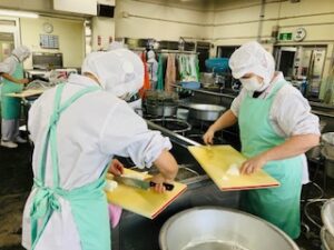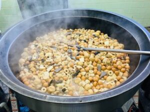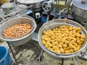 朝から給食室の大きなお釜でコトコト似たおでん、竹輪 や揚げボール、つみれに厚揚げ、がんもどき、うずらの卵…とたくさんの種類 の具材が入 ることで、うま味 の強 いおでんに仕上 がります。