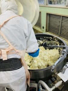 じゃがいもを蒸してつぶして、かたくり粉と混ぜていきます。
