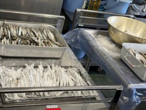 大量のししゃもにかたくり粉をつけていきます。