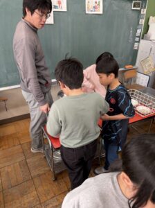 初めてのだし汁クイズ、少しむずかしいかな??と心配していましたが、『食缶のふたを開けたら、昆布の香りがした!』とか、『いつも鶏ガラを家で飲んでるからこれは鶏ガラじゃないと思う。』とか、様々なコメントをしながら、しっかり観察していました。