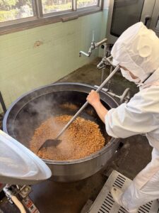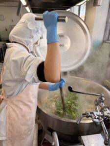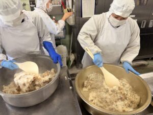 青のりと大豆を炊き立てごはんに混ぜていきます。