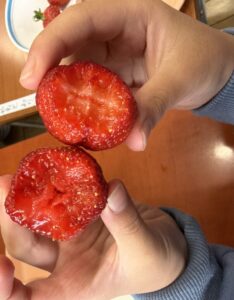 2つのいちごの色を観察。中の色が違うね✨