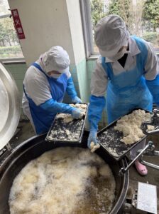 熱い油の中にお肉を入れます。